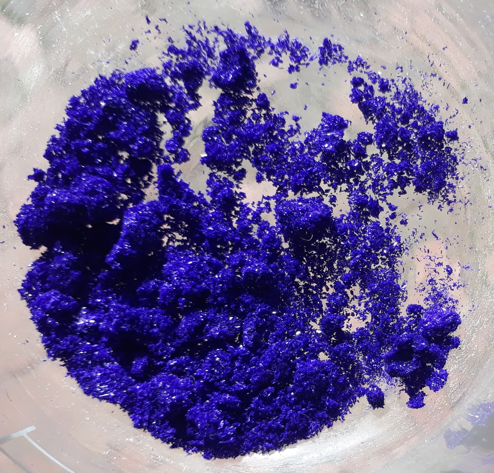 To the concentrated solution, I then added 32ml of 25% ammonia solution. I large amount of heat was given off and a precipitate formed. I stirred the mixture, pressing the precipitate against the sides of the beaker, whereupon it appeared to redissolve. Upon cooling, a large amount of dark blue crystals precipitated. This should be the tetraamminecopper(ii) dinitrate. Once the mixture had cooled completely to room temperature, I filtered off the product, pressing it well on the filter then scrapped it off into a 150ml beaker containing 20ml of acetone. The mixture was stirred well for a few minutes, then the product was filtered off and pressed again. Lastly the product was dried.
